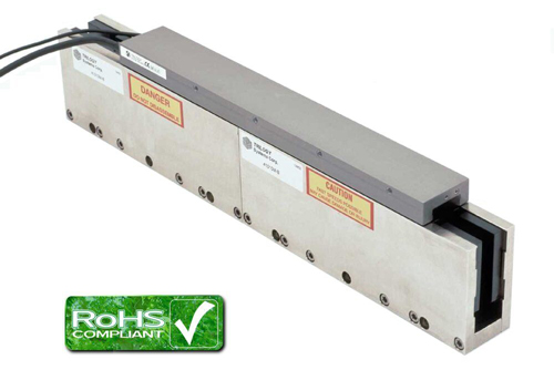 無鐵芯電機(jī)由一個(gè)動(dòng)子(繞組),運(yùn)行于雙磁軌之間。動(dòng)子線圈中沒有任何矽鋼片 - 故名無鐵心。相反,銅繞組被環(huán)氧樹脂封裝,安裝于兩行磁體之間的空氣間隙中。因?yàn)槔@組無鐵心,動(dòng)子和磁軌之間沒有吸引力或齒槽力。無鐵芯動(dòng)子因比有鐵芯動(dòng)子更輕而可以產(chǎn)生極高的加速度和整體動(dòng)態(tài)性能。無鐵芯設(shè)計(jì)因?yàn)闆]有齒槽力和吸引力而延長了直線導(dǎo)軌壽命,并且在一些應(yīng)用中,能夠選用較小的直線導(dǎo)軌。