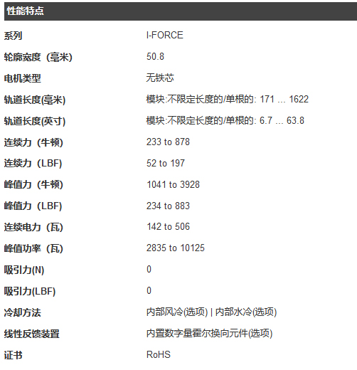 派克 I-Force 410 無鐵芯直線電機(jī) 相對(duì)于緊湊的體積提供高推力和急加速的能力. 持續(xù)推力范圍 233 N (52.4 lbf) to 878 N (197.5 lbf) ,峰值推力范圍 1041 N (234.1 lbf) up to 3928 N (883 lbf), 在I-Force系列提供極佳的性能和尺寸組合。專利的工字型骨架和重疊的繞組設(shè)計(jì)提高了電機(jī)的功率密度,改善了散熱,以及附加的結(jié)構(gòu)剛度。此外,無鐵心(或空氣芯)直線電機(jī)繞組與磁軌之間沒有吸引力。這樣便于安裝和運(yùn)動(dòng)過程中的零齒槽效應(yīng)。I-Force系列配備了超高柔性電纜。此外,派克提供模塊化磁軌實(shí)現(xiàn)無長度限制的行程。令人難以置信的是平滑運(yùn)行,高精度,高推力密度使I-Force系列直線電機(jī)成為要求苛刻的定位要求的理想解決方案。